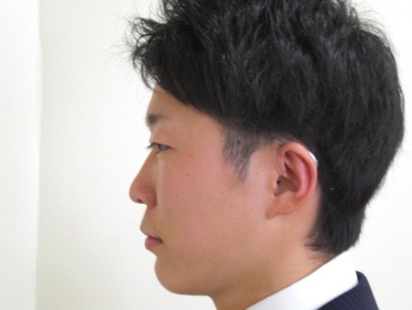 このように正面はもちろん横から見てもほとんどわからないくらい目立ちにくい補聴器です。