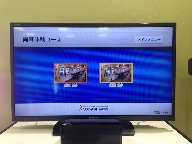 電車内の騒音下で朗読音を左右どちらかから流し、片耳のみの補聴器装用と両耳装用の違いを確認できます。