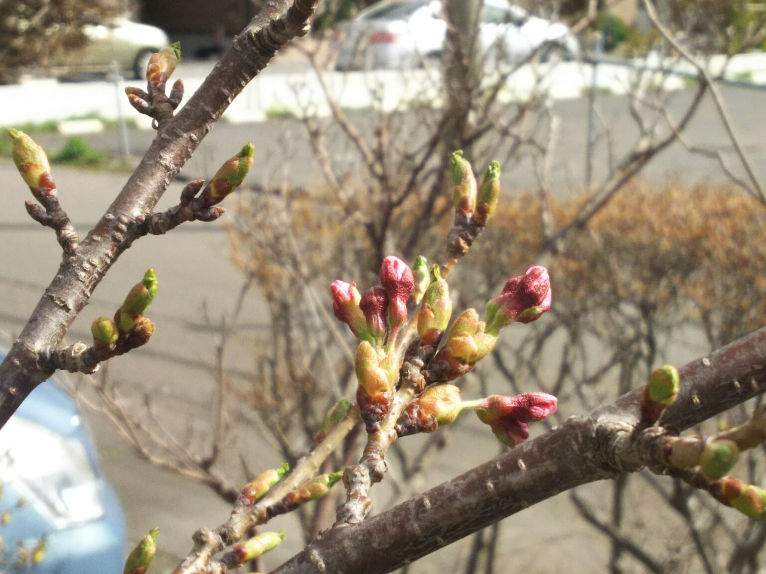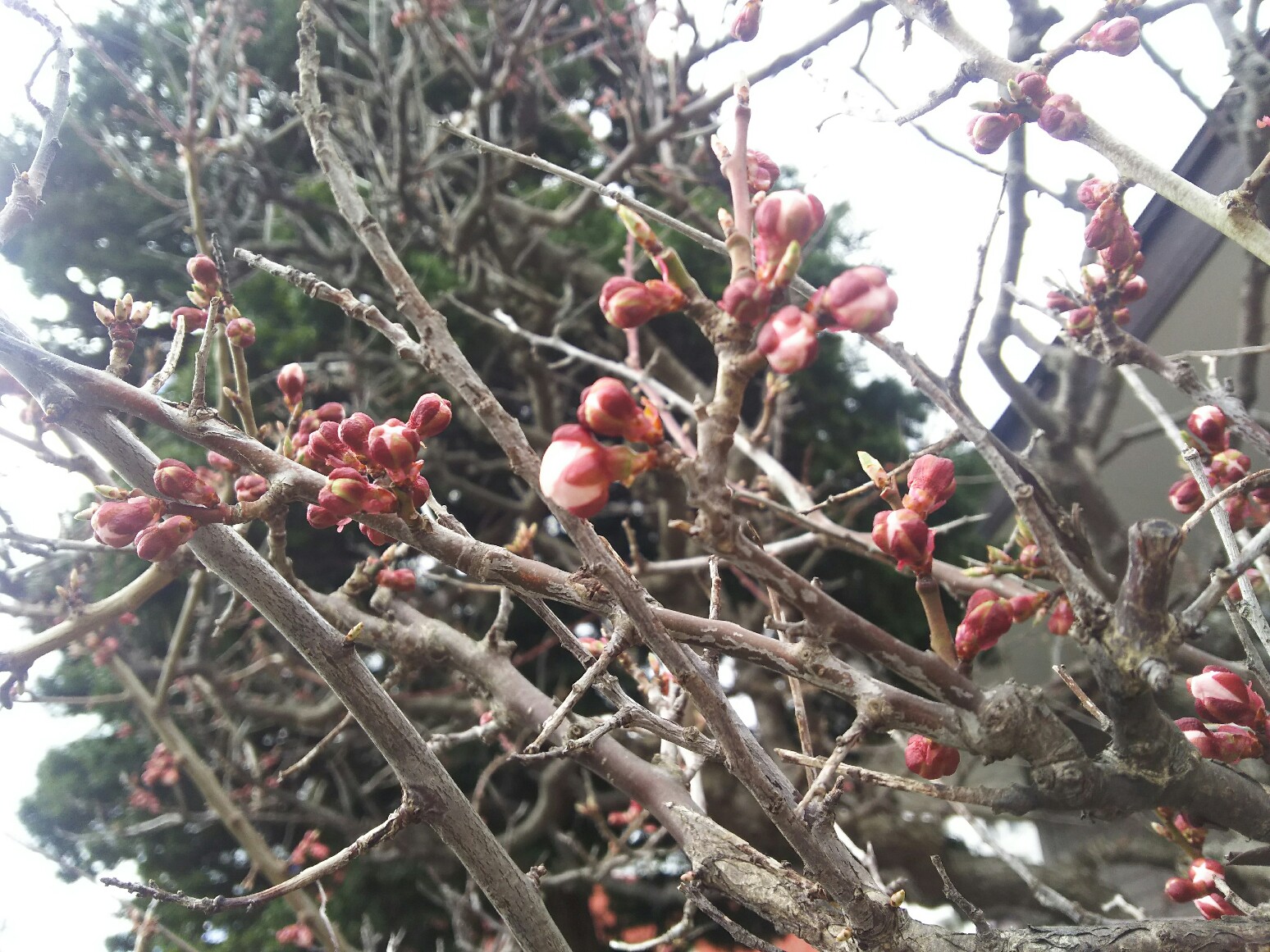 木の上の方のつぼみは少し開き始めています。
