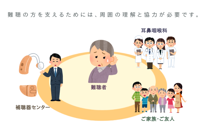 また、難聴の方の支えになるのは補聴器だけではありません。周りのご家族や友人知人の理解も必要になりますし、耳の状態を詳しく知るためにはまずは耳鼻科の先生に診ていただく必要があります。
