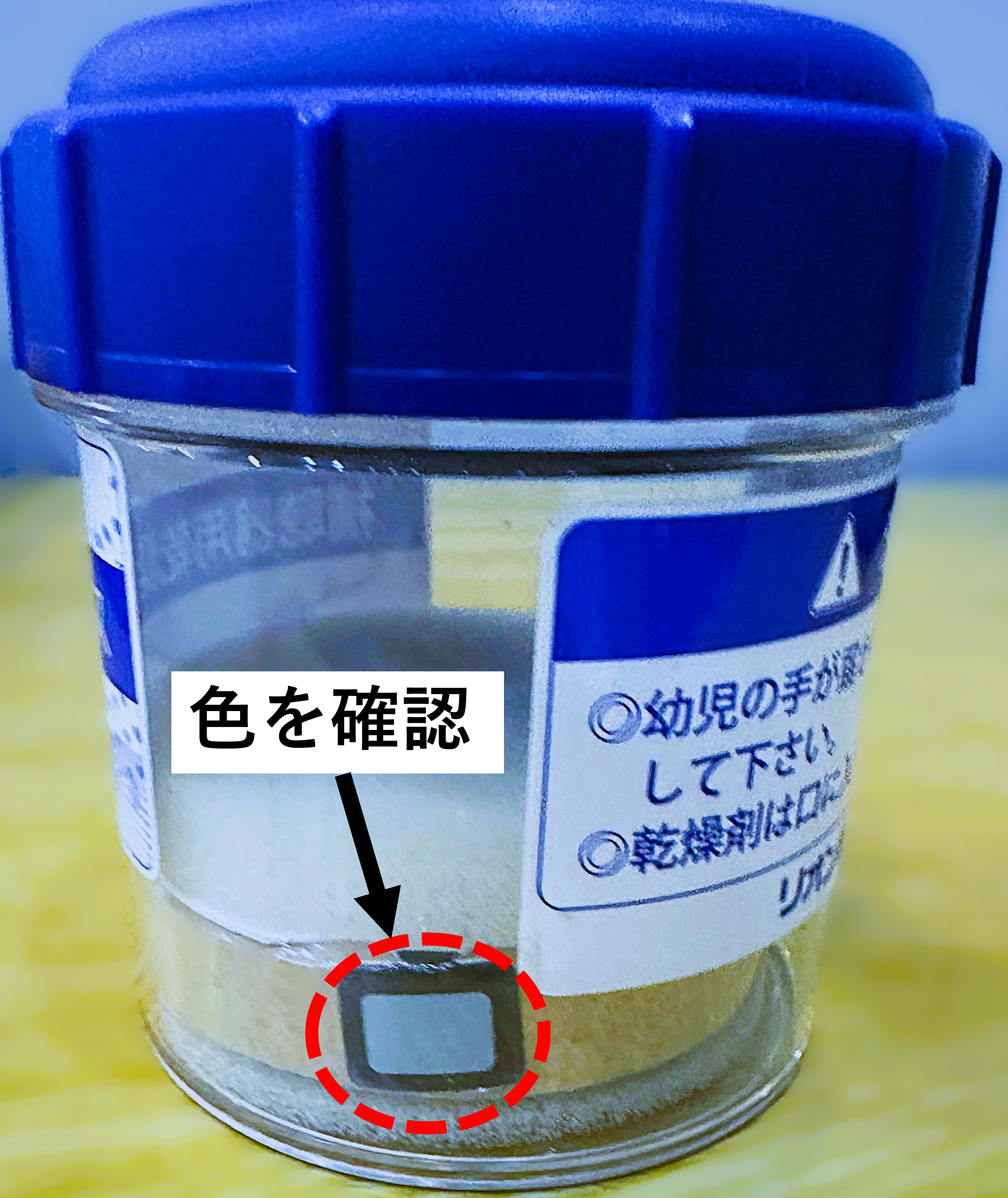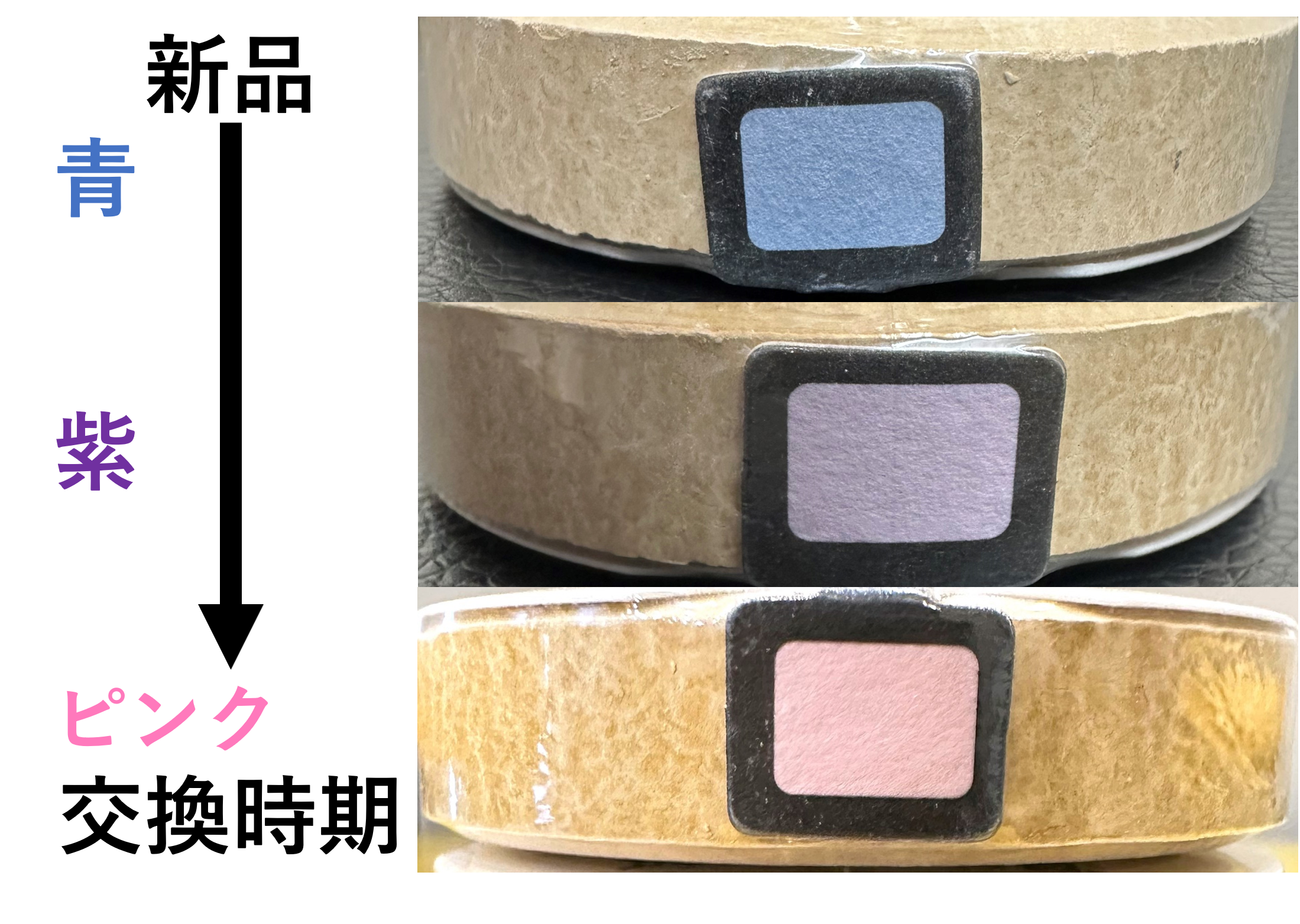 乾燥剤の側面には検知紙がついており、その検知紙が青からピンクに変化すると交換時期となっております。