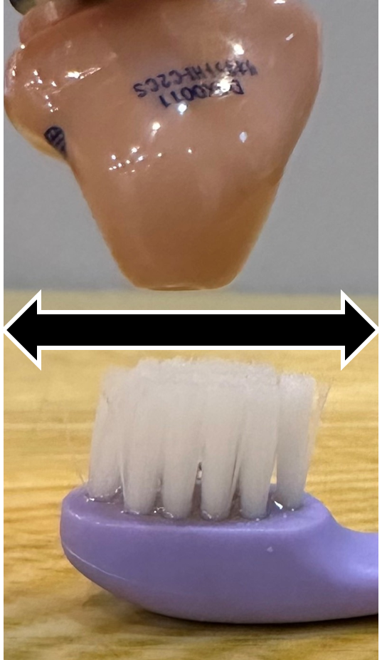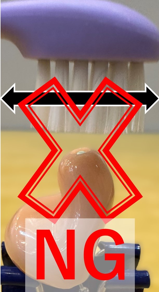 ブラシ(取れ太クン)を机などに置き、音口部を下に向けて前後にこすります。