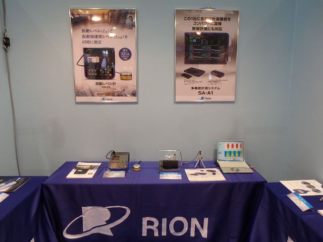 毎年出展しているこの展示会では音や振動の測定で使用する騒音計や振動計などの計測機器を中心に展示を行なっており、リオンの新製品をご覧いただける絶好の機会となっております。また、補聴器のカタログやポスターもあることから補聴器へ関心を寄せるかたも非常に多いです。