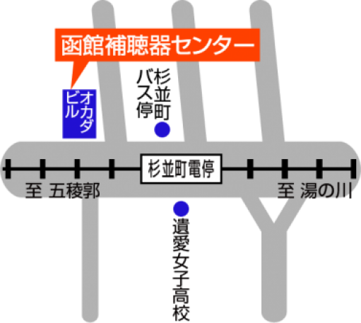 店舗からのメッセージ当店は1987年にオープンして、おかげさまで今年で35年を迎えます。長い間地域の皆様に支えられ、補聴器を通じて聞こえのお手伝いをさせていただいております。現在、函館では唯一の「認定補聴器専門店」で、お客様に安心して補聴器をご使用いただけるよう丁寧な接客を心掛けております。日頃の聞こえでお困りのことがございましたら、何でもご相談ください。 当店は日曜・祝日も営業しており、平日にはなかなかご来店出来ない方、ご家族と一緒にご来店される方など、多くの方々がいらっしゃいます。是非、お気軽にご来店ください。スタッフ一同お待ちしております。 【主な出張可能エリア(予約制)】 函館市内・せたな町・今金町・長万部町・八雲町・乙部町・江差町・厚沢部町・上ノ国町・松前町・福島町・知内町・木古内町・森町・鹿部町・北斗市・七飯町 【補聴器相談会 開催地】 江差町・森町・八雲町 認定補聴器専門店登録第1995-1013号 所在地函館市杉並町8-20 オカダビル 電話番号0138-56-8733 FAX0138-56-3358 営業時間平日9:00~18:00、日祝10:00~17:00 休業日第2・第4日曜、年末年始認定補聴器技能者小川 訓正、九十田 巧治 お支払いは現金またはクレジットカード(VISA、Mastercard、JCB、American Express)になります。 電子マネー(Kitaca、Suica、PASMO等)やQR・バーコード決済(PayPay、LINE Pay等)はご利用いただけませんのでお気を付けください。予約のご相談 Google マップ地図を印刷する アクセス 【電車の場合】 函館市電 杉並町電停駅(徒歩1分)。目標物→ビル屋上「補聴器」の看板。 【お車の場合】 道道南茅部線(市電道路)、杉並町電停駅近く。目標物→ビル屋上「補聴器」の看板。 【駐車場について】 オカダビル裏側に駐車場有(5台分) 予約のご相談 QRコードこのページはスマートフォン、タブレットでもご覧になれます。こちらのQRコードをご利用ください。