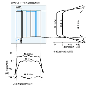 図a)のような縦5m×横4.5mに敷設したフラットループの磁気誘導の代表特性は図b)、図c)のようになります。