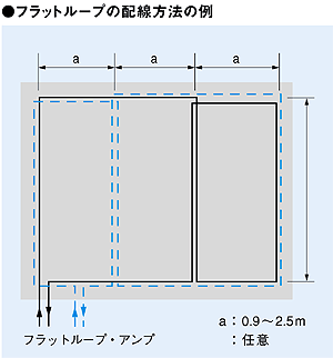 磁気ループ(フラットループ)は、設置する部屋を3枚以上の短冊を並べるように区切り、その線上に2組の導線を敷設したものです(右上図)。そこに90度位相が異なる信号電流を流すことにより、磁気ループ内水平面上において、ほぼ均一な磁界が得られます。 |